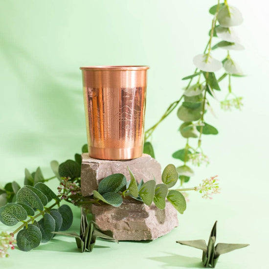 Copper is known to bring amazing proven Ayurveda benefits and is widely recommended by Yogis and Ayurveda experts. Water stored in a copper vessel (which is known as “tamra jal” in Ayurvedic medicine) balances the three doshas in your body (vata, kapha and pitta) by gently infusing the water with the positive health properties of copper. Studies show that copper also turns water into natural alkaline water, which helps balance your body’s pH levels. Perfect for every day, outdoors and for picnics. It's lighter than glass or more eco-friendly than plastic. Made of 99.7% pure copper A top quality product which has been laboratory tested to comply with EU Directive 98/83/EC Handcrafted with pride by skilled artisans using traditional engraving techniques Capacity 300ml Size 10 x 6 cm Weight 120g Wash before use.